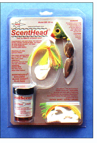 Complete ScentHeadTM set consisting of ScentHeadTM model Bass 3/8 BB with 3/8oz. stabilizing weight on the exclusive wire form. The bait is completely made up and ready to fish right out of the box. Just tie on your line (remove the head first, of course) and add a scent pad inside it --see instructions.